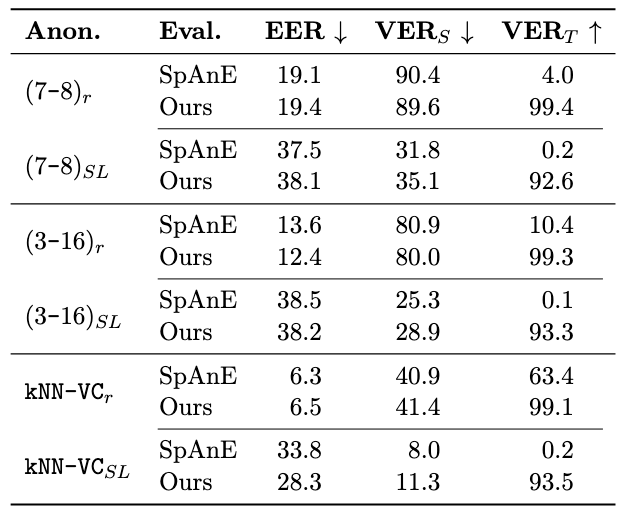 Since submitting the paper, I ran an additional experiment with the speaker-level TSA. This TSA is more challenging than the same-gender TSA, because the link between sources and targets is stronger (Panariello et al). For the same-gender TSA, each source’s utterances were anonymized with different targets; for the speaker-level TSA, they are all anonymized with the same target. The recognizer can improve its identification accuracy on the seen speakers of the training set much more when considering the targets selected by the speaker-level TSA. Our approach with adversarial learning is not able to force the recognizer to ignore targets, as you can see in the table below. Only for the weaker anonymizers (kNN-VC and to a lesser degree the (3-16) config of private kNN-VC) does adversarial learning improve the EER. The error rates for the target speakers are still much higher with adversarial learning, but they do not translate in better EERs, highlighting one of the main challenges of adversarial learning: the recognizer is trying to fool the target classifier, while still leveraging target information to identify the source speakers. Increasing the size and weight of the target classifier, to make it more foolproof, does not solve this issue. The mutual information between the two tasks is too strong; an adversarial approach is not enough to discourage the recognizer from exploiting the TSA.